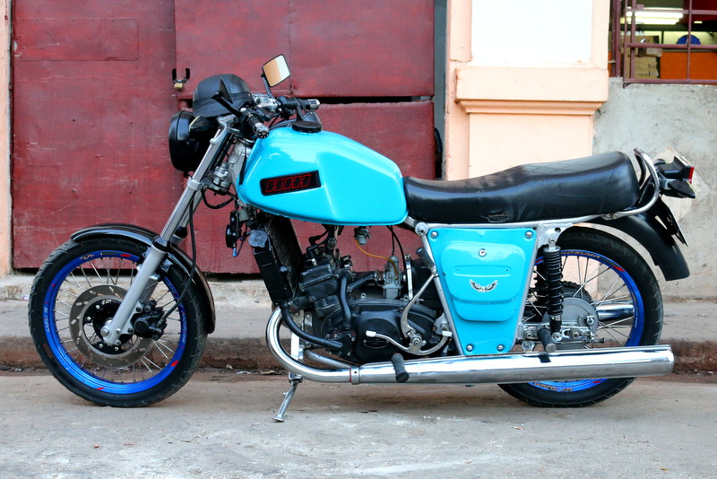 This is a standard MZ 250ETZ, which is the most commonly seen bike in Havana, Cuba. The motor is an air-cooled piston-port 250cc 2-stroke.